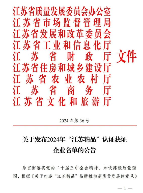 The brand building work of "Jiangsu Fine Products" is a pioneering effort by Jiangsu Province to promote the brand strategy in the new situation by referring to international practices and applying market mechanisms. Its main purpose is to use standards as the guide and certification as the means. Through third-party certification of products and services that meet high-standard and high-quality requirements, a group of "Jiangsu Fine Products" brands with independent innovation, high-end quality, excellent service, reliable reputation, and market recognition will be formed.