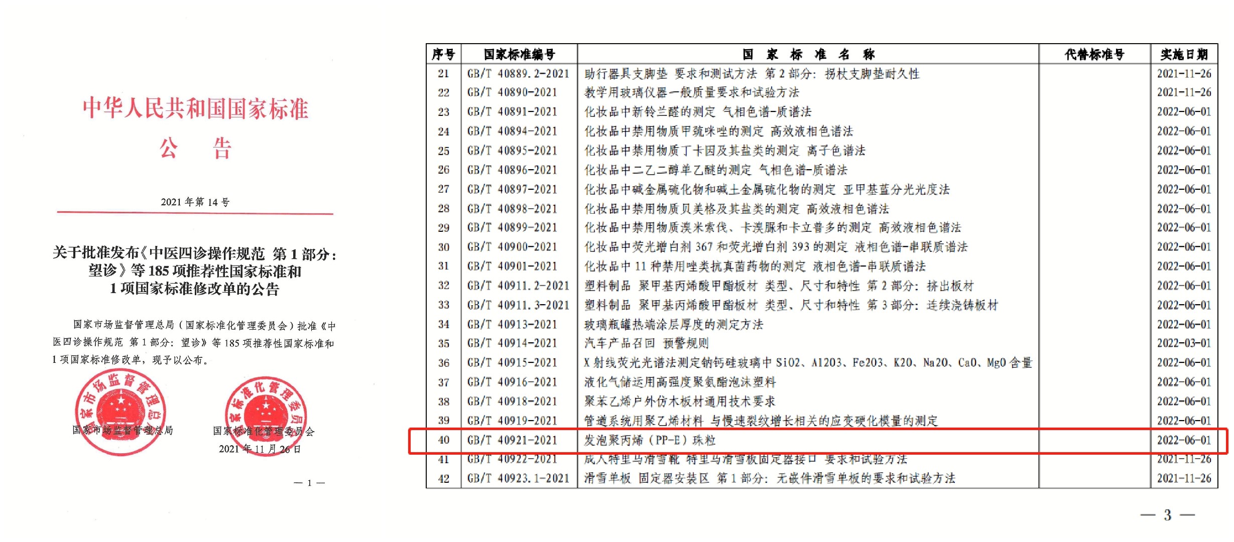 On November 26, 2021, the company took the lead in drafting, Beijing Technology and Business University, East China University of Science and Technology, Zhejiang University, Jiangnan University, Sichuan University, Beijing University of Chemical Technology, Nanjing Geili New Material Co., Ltd., and Changzhou Huaao Foam Plastic New Material Co., Ltd. participated The national standard GB/T 40921-2021 of "Expanded Polypropylene (PP-E) Beads" jointly formulated was approved and released!