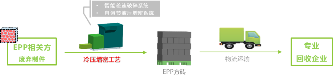 EPP waste parts can be compressed to more than 1/30 of the volume of EPP special-shaped waste parts through special cold-pressing densification equipment, that is, EPP square bricks;