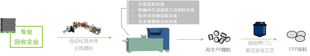 The regenerated PP particles prepared by the cold press densification process and the EPP special hot melt regeneration process have mechanical properties improved by more than 50% compared with the traditional melt granulation process, and the melt strength is restored to more than 90%. It is suitable for supercritical carbon dioxide of EPP Kettle pressure foaming process;